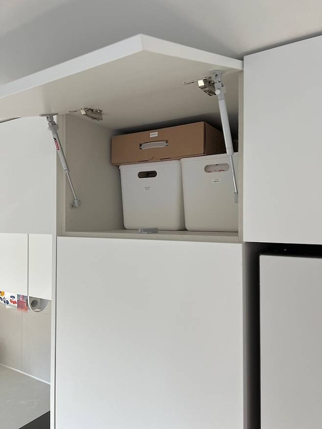 냉장고장 위쪽으로도 수납공간을 넓게 제작했어요. 깊이가 굉장히 깊어서 수납이 정말 많이 되더라구요. 자주 사용하지 않는 물건들을 수납함에 보관해서 이름표를 붙여서 물건을 정리해 두었어요. 수납함에 이름표를 붙여 놓아서 찾을 때도 쉽고 깔끔하게 정리할 수 있어요.