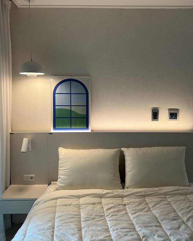 처음 마이너스 옵션으로 계약하고 사전점검 왔을 때 방이 작아보였는데 오히려 가구들이 들어오고 나니 방이 더 넓어보였어요. 안방 침대는 요즘 유행하는 호텔형 침대 프레임을 구매했어요.