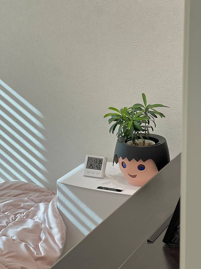 침대 옆 협탁에는 온, 습도계와 아스파라거스 나누스 화분을 두었어요.