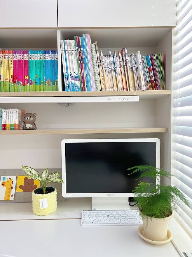 한쪽 책상에는 기존에 사용하던 컴퓨터도 두었구요. 가끔 작업할 때 사용하는 제 공간이기도 해요.
