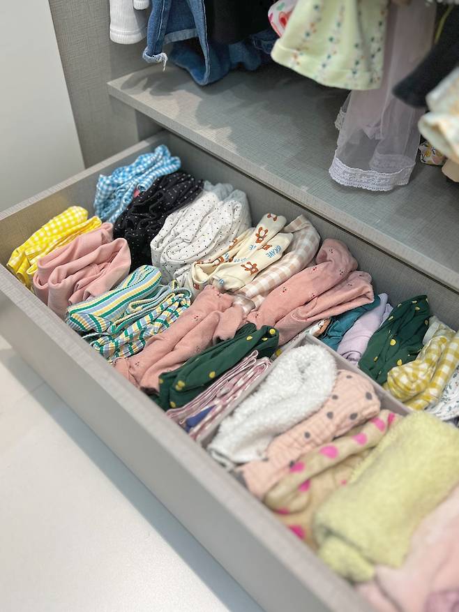 아래 칸에는 아이들 내복과 수면 조끼를 보관하고 있어요.