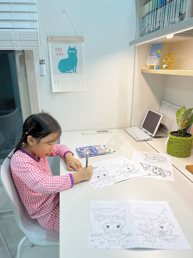 요즘 산리오 캐릭터를 좋아하는 우리 첫째딸, 저녁마다 책상에 앉아서 색칠을 즐겨해요.