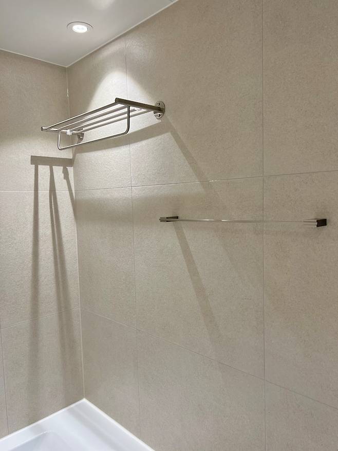 샤워수전 옆에는 샤워볼을 걸 수 있도록 미니 옷걸이를 요청드려서 시공했어요.
