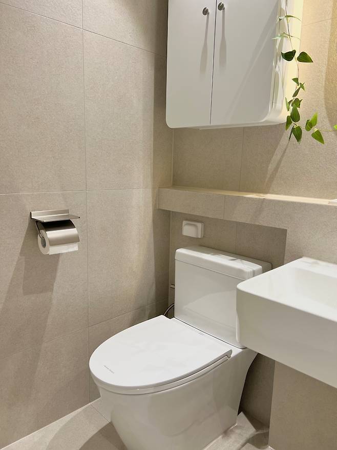 그런데 이렇게 화사한 화장실로 시공되었답니다. 안방 화장실과 달리 거실 공용 화장실은 조금 더 밝은 베이지 색상의 포세린 타일을 골랐어요.