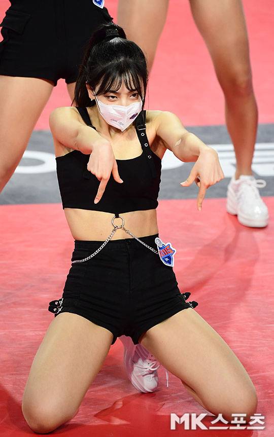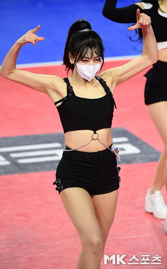블랙 브라톱과 핫팬츠 의상으로 건강미 뽐내는 목나경 치어리더.
