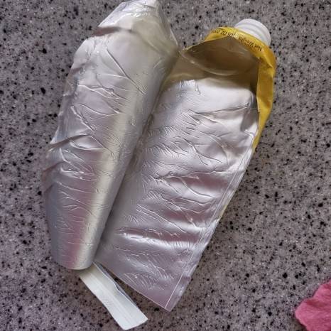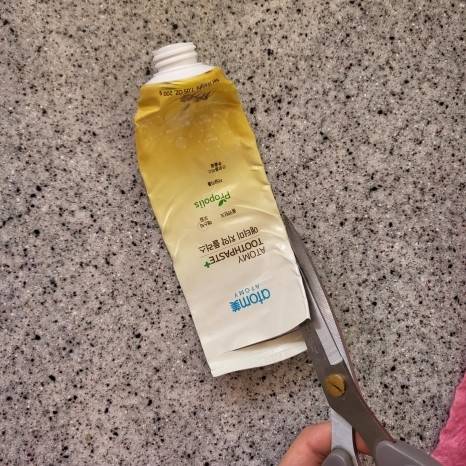 플라스틱 뚜껑은 돌려서 버리구요. 가위로 반을 갈라주세요. 저 안쪽 부분에 치약이 몰려있네요.