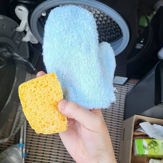 세탁기 청소가 끝나면 세탁기 문을 닦아줘야 해요. 스폰텍스나 수건을 쓰기도 하는데요, 편하신 걸로 닦아주시면 됩니다.