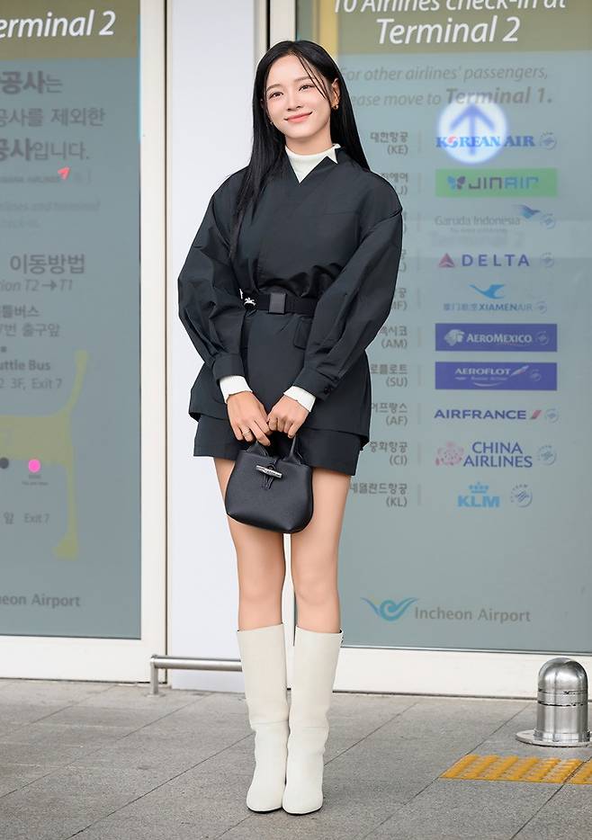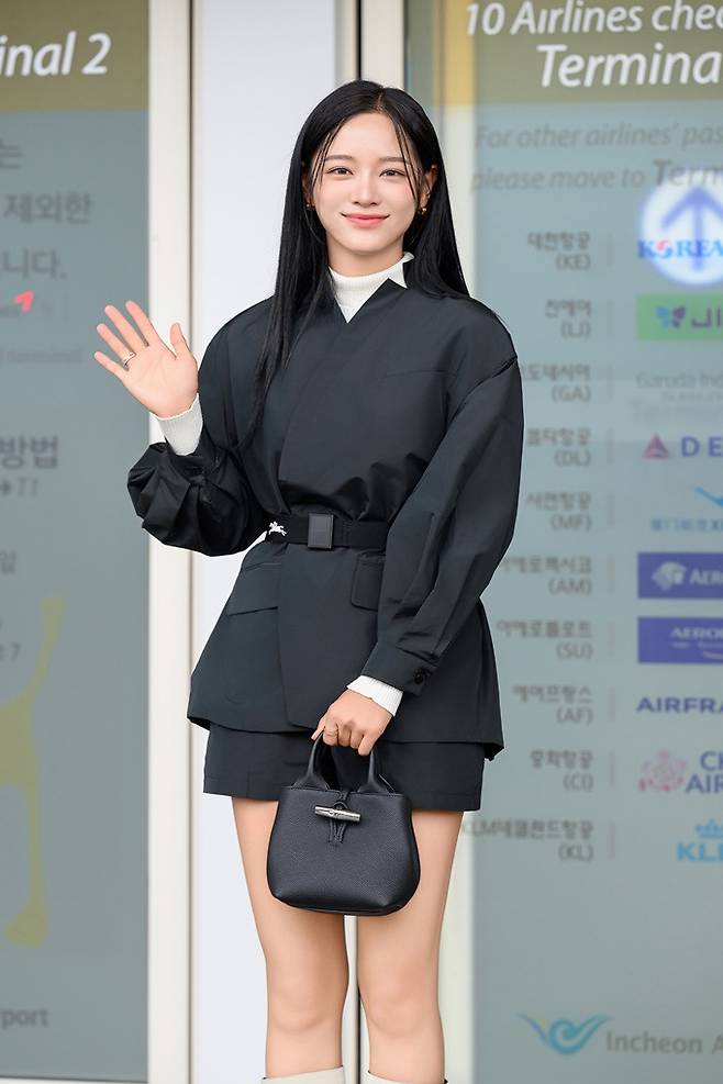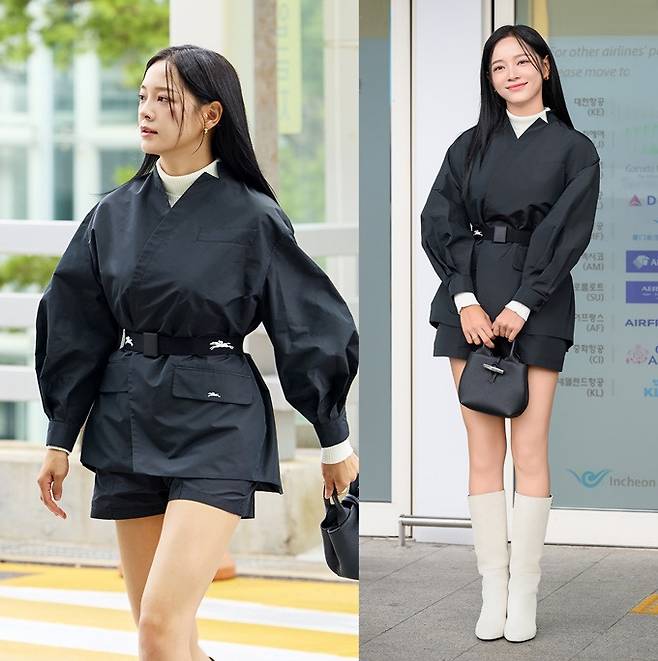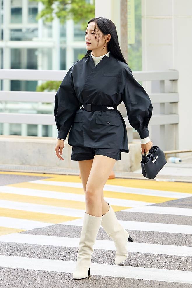 롱샴 앰버서더로 활동 중인 김세정은 퍼프스 디테일이 돋보이는 블랙 컬러의 기모노 재킷과 블랙 쇼츠를 매치한 스타일리시한 블랙룩을 선보였다.