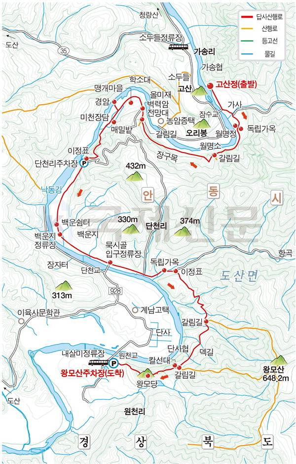 거리가 멀어 대중교통은 당일 산행이 불가능하다. 승용차 이용 때는 경북 안동시 도산면 가송길 177-42 ‘고산정’을 내비게이션 목적지로 설정하고 간다. 정자 입구에 5, 6대 승용차를 댈 만한 주차공간이 있다. 산행 뒤 왕모산주차장에서 도산개인택시(054-954-3141·010-7354-1033, 택시비 2만8000원 선)를 불러 승용차를 주차해 둔 고산정으로 간다.