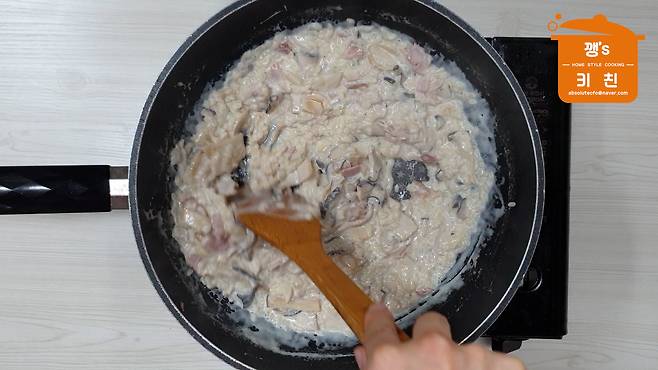 불린 쌀, 버섯, 양파 1/2, 베이컨,
