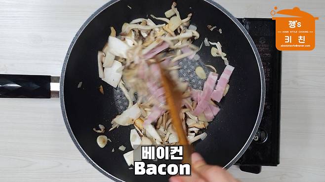 버섯과 베이컨을 넣고 볶아주세요