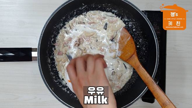 우유를 추가하며 볶아주세요