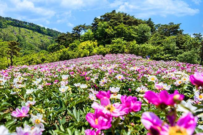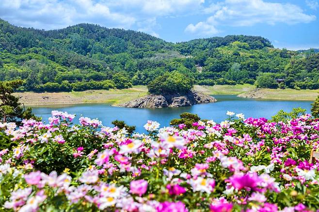 봄에는 꽃잔디가 섬을 붉게 물들이고, 이어서 5월에는 화려한 작약꽃과 꽃양귀비, 6월엔 수국이 차례로 피어납니다.