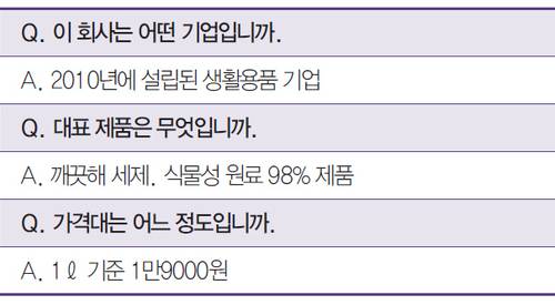 예를 들어 우리는 2010년에 설립된 생활용품 기업으로, 대표 제품은 식물성 원료 98%로 만든 ‘깨끗해 세제’, 가격대는 1ℓ 기준 1만9000원이다.