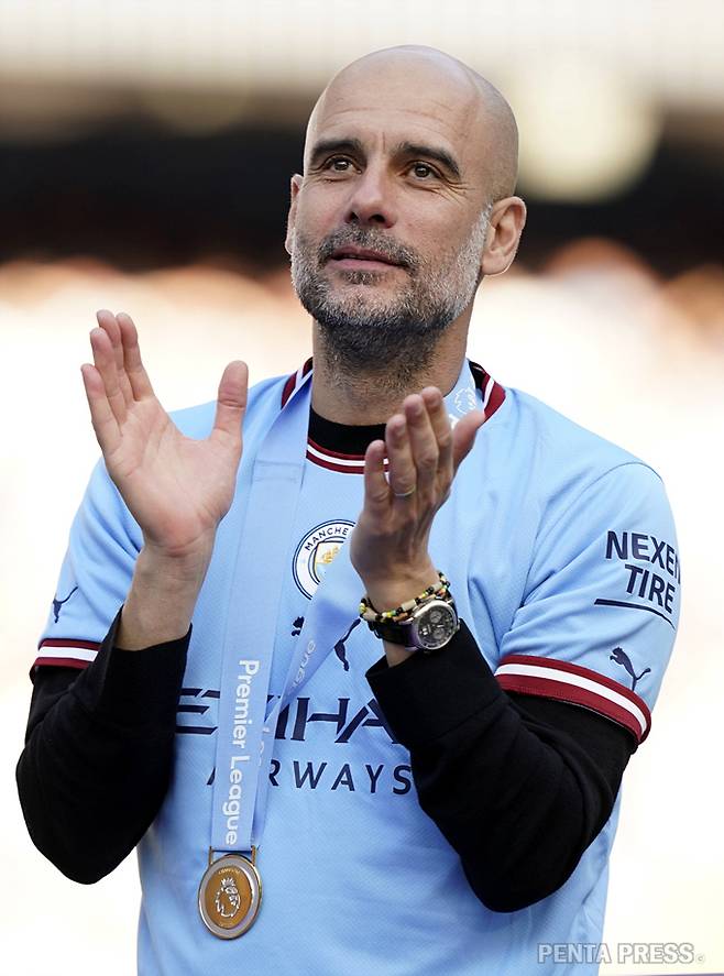 [ 맨체스터, 영국(현지) - 2023/05/21 ] 맨시티에 5번의 우승을 안긴 펩 과르디올라 감독이 우승 메달을 목에 걸고 박수를 보내고 있다.
