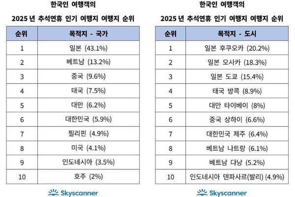 스카이스캐너 여행 전문가 제시카 민은 “올 추석 인기 여행지 10곳 중 6곳이 비행시간 3시간 이내의 단거리 노선이었다”며 “특히 일본 후쿠오카는 지난해 추석 대비 검색량이 259% 급증해 부담 없이 떠날 수 있는 여행지로 인기가 높다”고 설명했다.