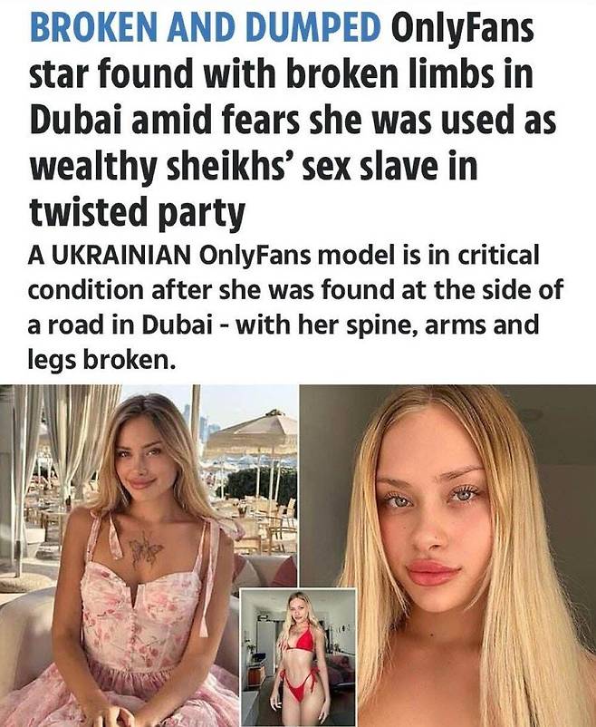 온리팬즈 스타가 두바이에서 척추, 팔, 다리가 부러진 채로 길가에서 발견됨..