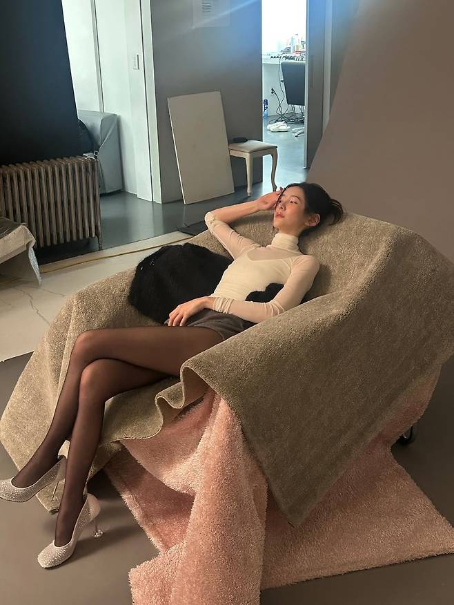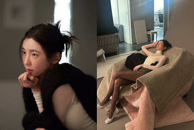 그녀는 몸의 실루엣이 은은하게 비치는 화이트 시스루 터틀넥에 블랙 스타킹만을 매치, 다리 라인을 과감하게 드러냈습니다.