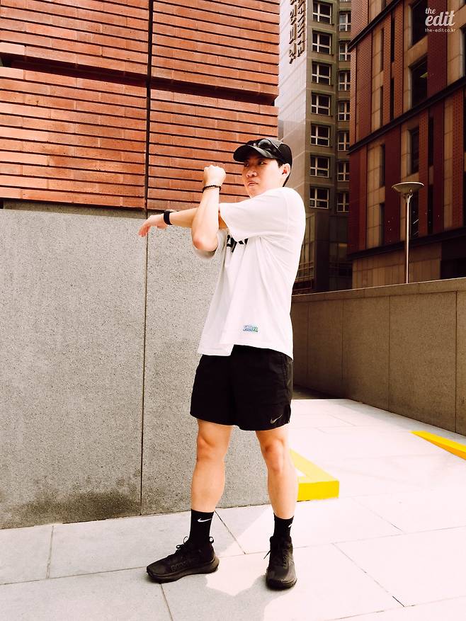 임동진은 러너이자 클라이머다. 그는 클라이밍 브랜드 ‘오름(orumm)’을 운영할 정도로 클라이밍에 진심이다. 처음 뛰기 시작했을 때 그에게 러닝은 클라이밍의 보조 운동이었다. 그런데 꾸준히 뛰다 보니 러닝을 하는 동안 명상을 하는 것 같은 기분이 들었다. 하루 동안 생겨난 부정적인 감정을 뛰는 동안 정리할 수 있었다. 그 이후로 달리기를 보조 운동이 아니라 자연스럽게 하는 독립된 운동으로 받아들이게 되었다. 지금은 달리기 자체가 좋아서 뛴다.