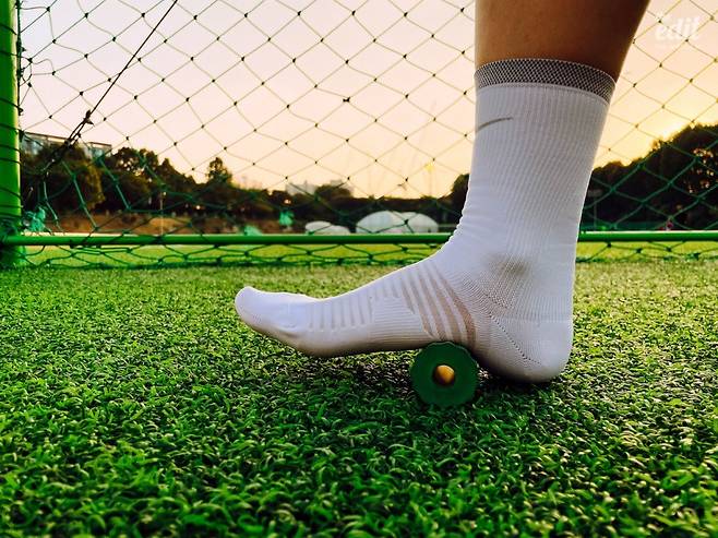 추천 아이템_풋롤러_10년 가까이 사용하고 있는 풋롤러를 추천한다. 달리기 전, 후로 발 근육을 풀어주기 위해 사용한다. 부드러운 탄성과 함께 롤러 중앙에 구멍이 있는 원통형 구조라 발을 굴리는 압력에 따라서 적절한 자극을 줄 수 있는 것이 가장 큰 장점이다. 골프공처럼 마사지하다가 놓쳐서 멀리 굴러가지도 않고 미끄럽지 않은 천연고무 소재라 추천한다. 작고 가벼워서 여행 중에도 가지고 다닐 수 있다.