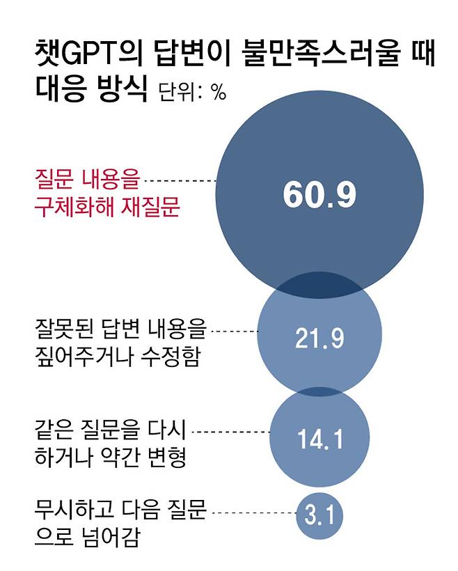 챗GPT 같은 생성형 AI 모델들로부터 원하는 수준의 답변을 얻지 못할 경우 사용자들은 어떻게 대응할까? 많은 사용자는 질문을 좀 더 자세하게 작성하여 다시 물어보거나, AI 모델의 답변 중에 부정확한 부분을 짚어주는 적극적인 반응을 보였다.