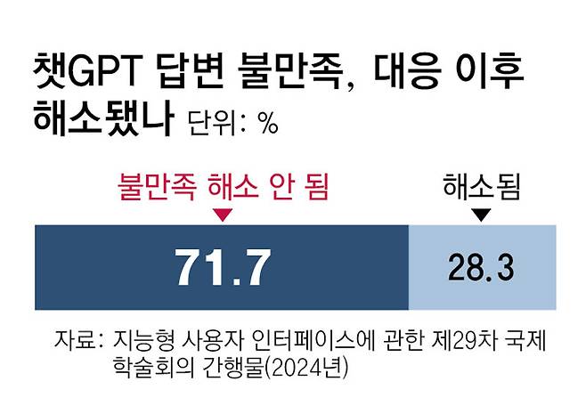 이러한 문제점을 해결하기 위한 HCI 분야의 연구들이 진행되고 있다. 우리나라의 KAIST 연구팀을 중심으로, 그리고 필자도 참여한, 최근 연구(Understanding users’ dissatisfaction with chatgpt responses·김윤수 등)는 생성형 AI 모델 사용자들이 어떤 상황에서 어떤 이유로 불만족을 느끼는지, 사용자 특성에 따른 차이를 분석했다.