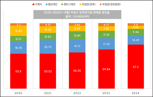 기계식 키보드는 이미 2020년 이전부터 전체 키보드 판매량의 50% 이상을 차지하고 있는 주류 제품이지만, 2020~2022년까지 3년 동안 점유율 50~55% 사이에 갇혀서 더 이상 보급이 안 되고 있었다. 그러던 기계식 키보드의 시장 점유율이 올해 들어 많이 늘었다.