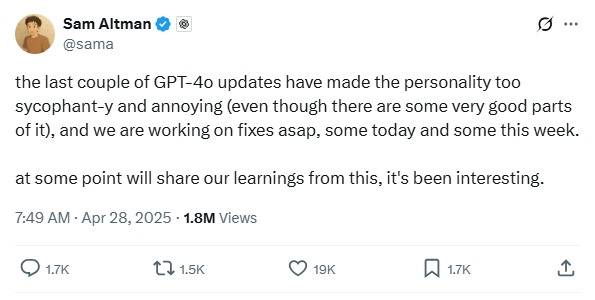 오픈AI의 최신 AI 모델 GPT-4o의 '성격(personality)'이 곧 변경될 것으로 보인다. 28일(현지 시간) 오픈AI CEO 샘 알트먼(Sam Altman)은 본인의 X(구 트위터) 계정을 통해 “최근 몇 번의 업데이트가 GPT-4o의 성격을 너무 아첨하는데 능숙하고 짜증나게 만들었다”며 “가능한 빨리 수정 작업을 진행하고 있으며 오늘과 이번 주에 수정할 계획”이라고 밝혔다. 그리고 그는 “언젠가는 이 과정에서 얻은 교훈을 어려분과 공유할 것이며 흥미로운 경험이었다”고 말했다.