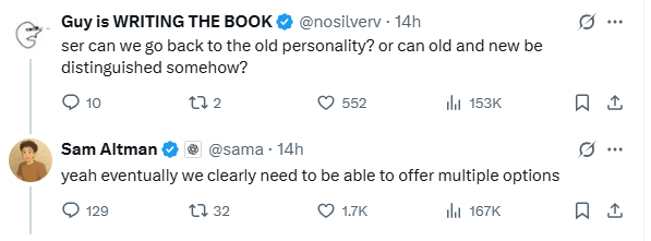 X의 한 유저는 '챗GPT가 예전 성격으로 돌아갈 수 있을까요? 아니면 예전 버전과 지금 버전을 구별할 어떤 방법이 있나요?'라고 물었고 샘 알트먼은 '네, 우리는 분명히 여러 옵션을 제공할 수 있어야 합니다'라고 댓글을 달았다.