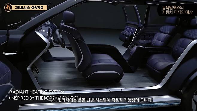 GV90의 실내는 편안하고 고급스러운 분위기를 연출한다. 온돌 난방 시스템이 뒷좌석에 적용되고, 최고급 소재가 사용되어 움직이는 VIP 라운지와 같은 경험을 제공한다. 롤러블 디스플레이와 미니멀 럭셔리 요소들로 공간 활용도와 감성을 극대화했다.