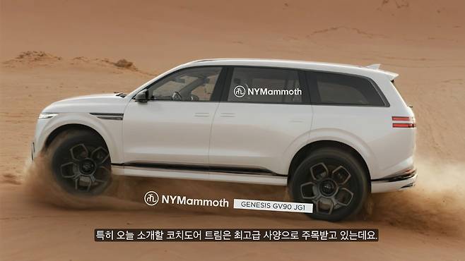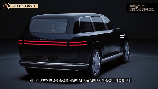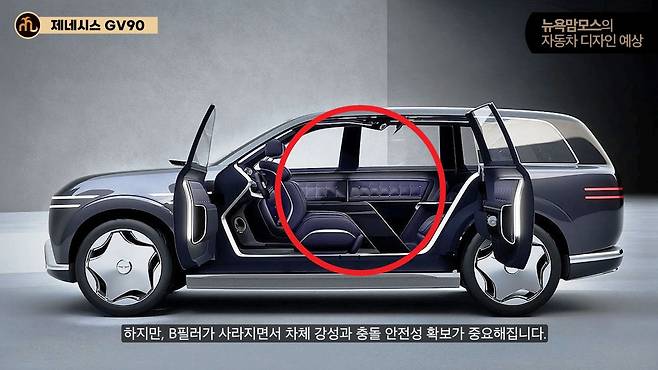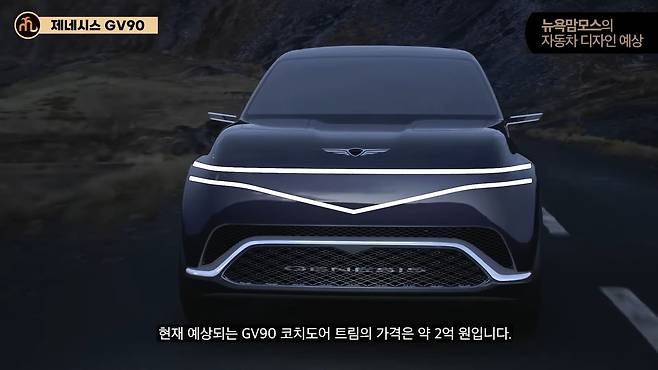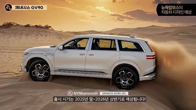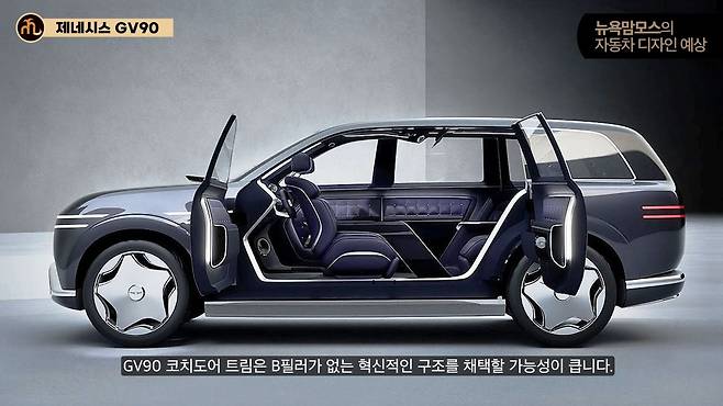 GV90 익스클루시브 트림 코치도어의 예상도가 뉴욕맘모스에 의해 공개됐다. 공개된 이미지를 통해 새로운 제네시스 GV90의 측면 디자인을 확인할 수 있었다.
