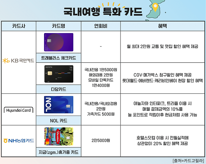 해외뿐만 아니라 국내 여행에서도 다양한 혜택을 카드가 시중에 출시 돼 있다. KB국민카드의 트래블러스 체크카드는 전월 실적 20만원 이상 결제 시 카페·빵집·철도·고속버스·주차장·전국 맛집에서 할인이 제공된다. 또한 KB페이를 이용해 온·오프라인에서 결제할 경우 월 최대 2만원까지 할인받을 수 있다.