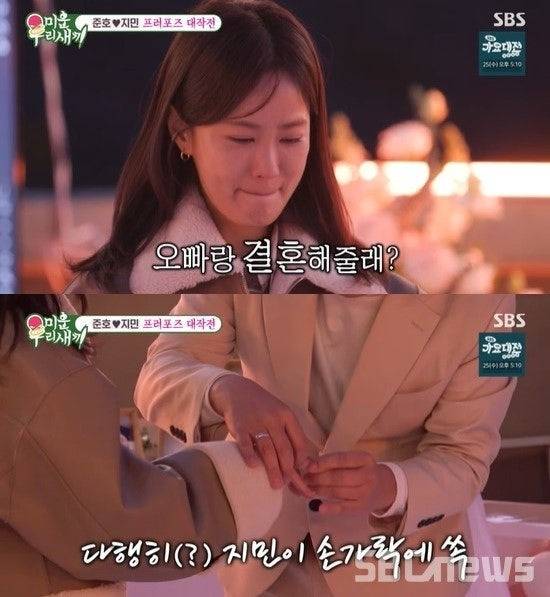 김지민 언니는 김준호 오빠의 진심 어린 고백과 프러포즈에 눈물을 터트렸고, 김준호 오빠는 “지민아 진짜 모자라고 부족한 오빠를 사랑해 줘서 고맙고, 앞으로 아프지 말고 우리 오랫동안 사랑하자”라며 “오빠랑 결혼해 줄래?”라고 다시 한번 청혼! 김지민 언니는 “껴줘”라며 그의 프러포즈를 받아들여 대성공으로 마무리되었답니다! 🎉