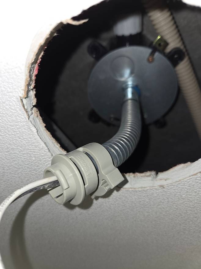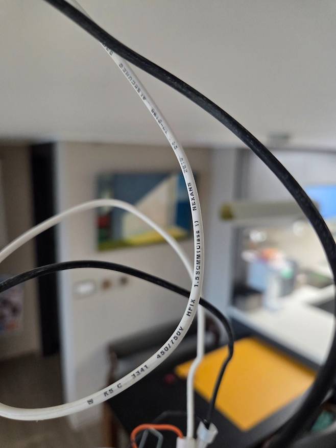 천장에서 내려오는 검정, 흰색 선에 실링팬 전원선을