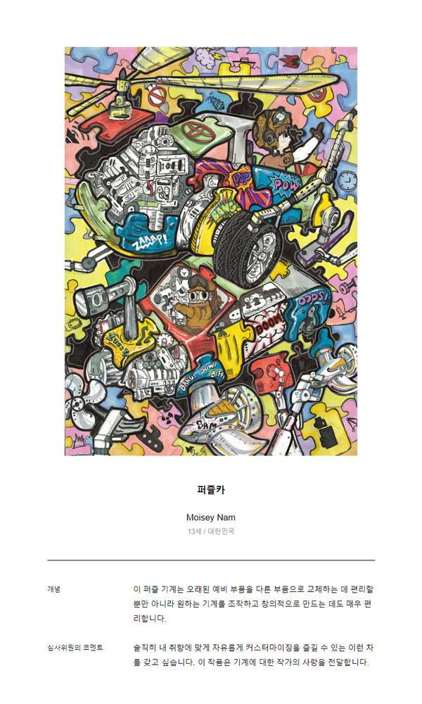 이 중 ▲만 12세 이상 만 15세 이하 부문에 진출한 남모세 어린이의 ‘퍼즐카’ 작품은 오래된 부품을 쉽게 교체할 수 있는 특징과 함께 원하는 형태의 차량을 창의적으로 만들 수 있는 꿈의 자동차를 그렸다. 기존 자동차의 틀을 깨고 사용자가 자유롭게 커스터마이징 할 수 있는 차량을 떠올린 뛰어난 창의력과 더불어, 기계에 대한 깊은 애정을 전달했다는 점에서 높은 심사 평가를 받아 특별상을 수상하게 되었다. 남모세 어린이와 소속 학교인 이음중학교에는 교육 증진 목적으로 각각 5천 달러와 1만 달러의 상금이 전달될 예정이다.
