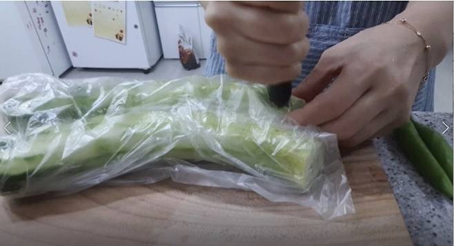 손질한 오이는 위생팩에 넣어 칼등으로 탕탕 쳐주세요