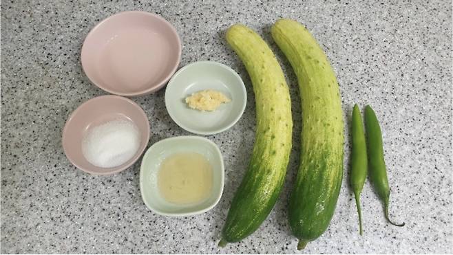 오이 2, 청양고추 2, 다진 마늘, 설탕, 식초, 매실액 등