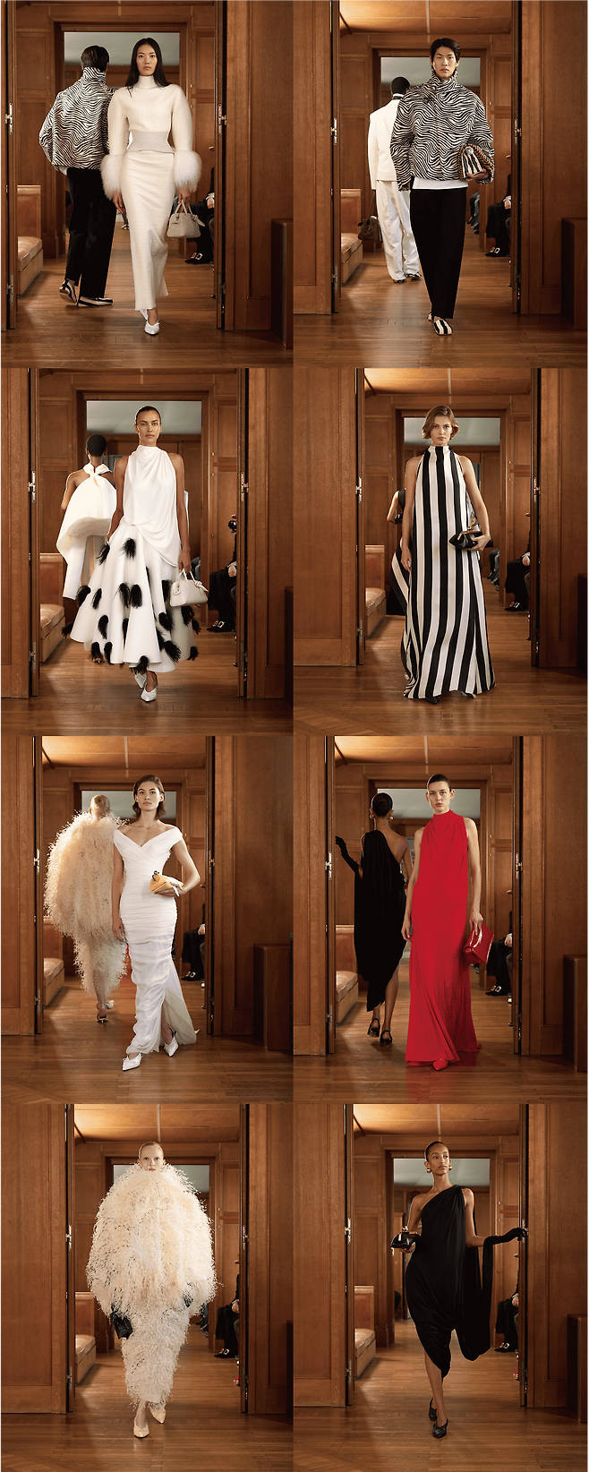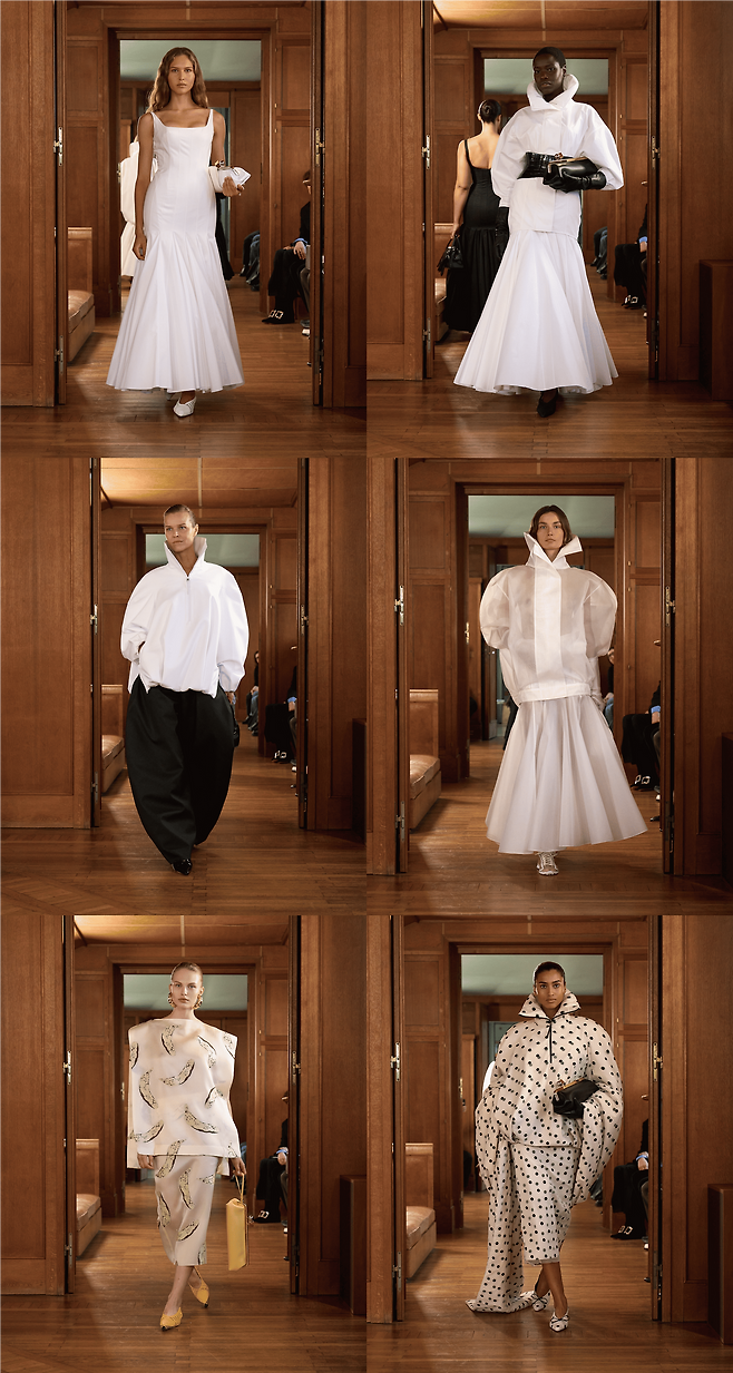 장인 정신이 깃든 디테일 또한 눈길을 끈다. 핸드 페인팅으로 완성된 오간자, 입체적인 볼륨을 연출한 라피아 자수, 르마리(Lemarié)가 제작한 풍성한 타조 깃털 장식이 전통과 현대 기술의 조화를 보여준다. 컬러 팔레트는 블랙과 에크루의 강렬한 대비를 기본으로, 레드, 오렌지, 캑터스 그린, 바나나 옐로우 등이 자크뮈스의 시그니처 톤으로 활용되었다.