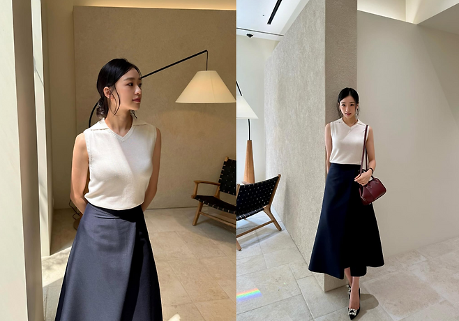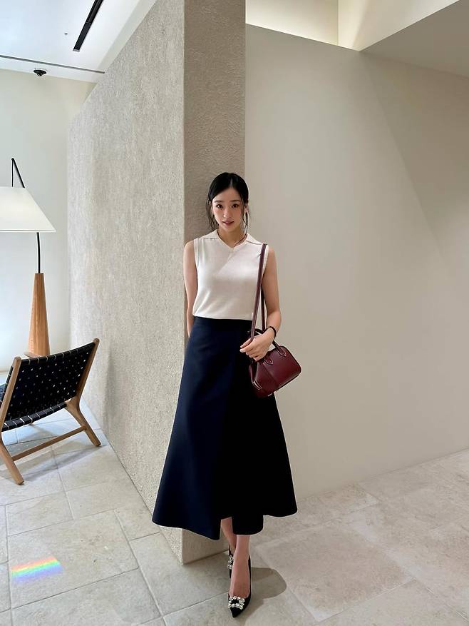 공개된 사진 속 손연재는 화이트 슬리브리스 니트에 차분한 블랙 스커트를 매치했다.