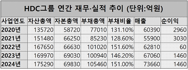 HDC그룹의 지난해 말 자산총액은 17조5290억원이며 이 중 자본이 6조9830억원, 부채가 10조5460억원이다. 전년 대비 부채가 4520억원 증가하면서 부채비율은 151%를 기록했다. 부채 증가는 운용자금을 선제적으로 조달한 것이며 대형 사업지인 광운대역세권개발(서울원 아이파크) 사업비를 조달한 영향도 있다.