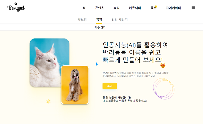입양 시 이름 지을 때뿐만 아니라, 재미있는 별명을 짓고 싶을 때 이용해도 좋아요. 재미있는 별명들을 비마이펫 커뮤니티 내에서 함께 공유하면 더 재미있게 즐길 수 있어요.