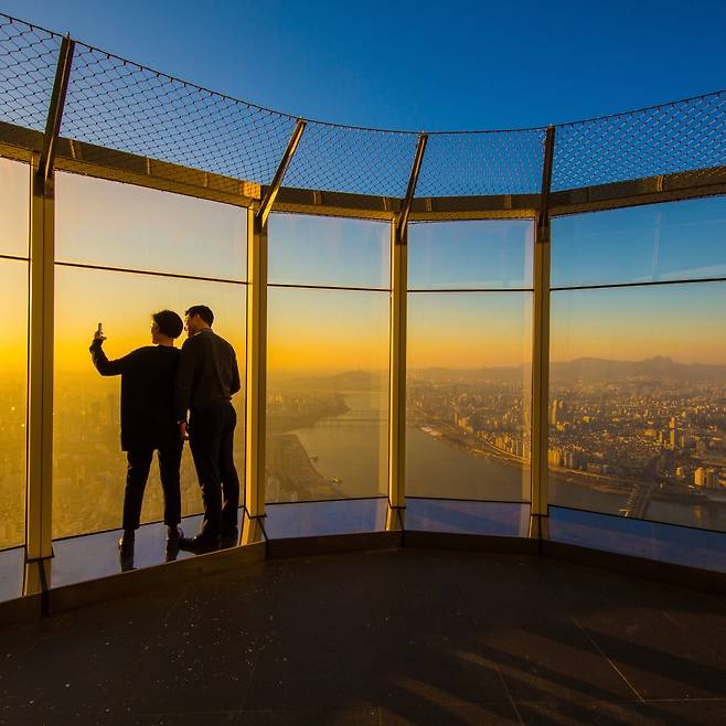 서울스카이는 ▲스카이데크 ▲스카이테라스 ▲123라운지 등으로 구성되어 있으며, 지하 1~2층 전시존에서는 ‘한국의 탄생과 자부심’을 주제로 한 미디어 아트 전시가 관람객을 맞이합니다.