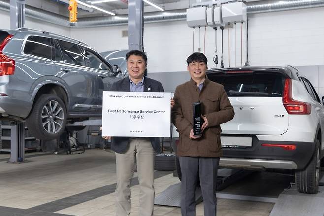 2024 볼보자동차코리아 서비스 딜러 어워드' 성료 (왼쪽부터 코오롱오토모티브 서비스 김태길 본부장, 볼보자동차 서초 서비스센터 최락천 지점장. 사진=볼보코리아