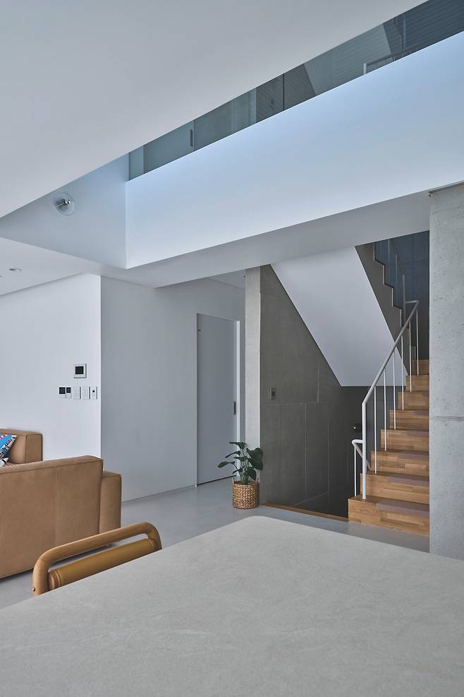 대지는 한 개 층 정도가 높은 성토 부지였다. 낮은 지대인 남쪽은 단지 내 도로와 접하기에 자연스럽게 지하층의 진출입구를 계획했다. 지하층에는 취미실과 창고, 선큰, 현관을 배치했다. 계단을 통해 한 층 오르면 갑자기 확 트인 거실과 주방, 그 너머로 테라스와 열린 조망까지 시선이 이어진다. 대지의 단차로 자연스럽게 만들어진 1층 테라스는 거실과 주방을 더한 면적과 동일하다. 큰 창을 거친 시각적인 확장은 테라스를 실내의 연장처럼 느끼게 한다. 테라스의 담과 벽은 외부 시선은 가리면서 불필요한 풍경을 차단하는 역할을 한다.