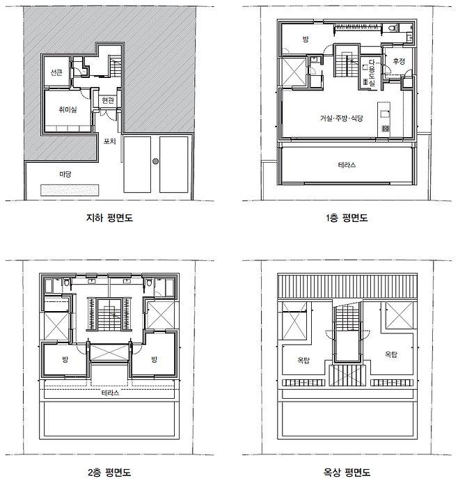 건축주의 생각은 설계 방향을 잡는 가장 중요한 기준이다. 개인을 위한 주택이니 건축주의 생각만 잘 반영할 수 있다면 일단 만족이다. 핵심 사항이 해결되고 나면 나머지 조건들은 얼마든지 절충할 수 있다. 이번 ‘무언가’도 마찬가지였다. 층별, 실별 요구사항들이 꽤 있었지만 설계하다 보면 자연스레 해결되는 내용이었고 정작 중요한 것은 크게 네 가지였다.