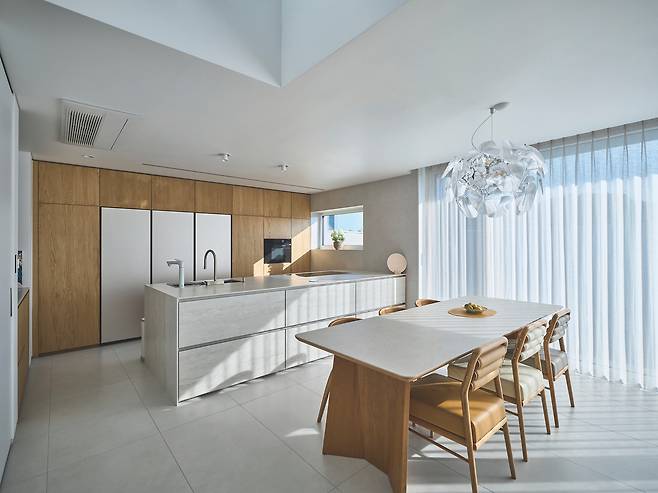 넷째, 거실과 주방은 하나의 큰 공간이 좋습니다. 특히 큰 창문과 조망이 확 트이면 좋겠습니다.”
