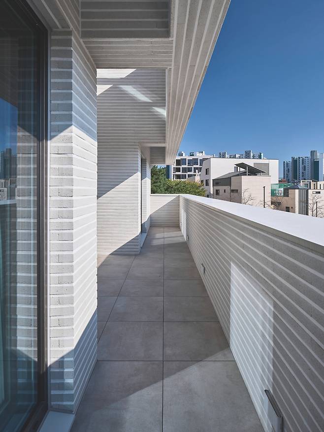 높은 벽은 수직이고 낮은 담은 수평이다. 대지 주변에 지배적인 풍경으로 자리한 대단지 아파트의 이미지는 수직적이다. 이에 대조되는 수평적 요소를 집의 형태나 공간으로 강조한다면 아파트와 주택들이 겹친 동네 풍경에서 적절한 대비의 긴장감이 집의 윤곽을 더욱 확고히 만들어줄 수 있다고 판단했다.