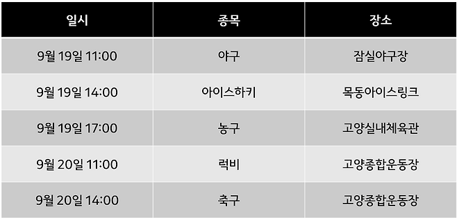 9월 11일 오전 11시 ⚾야구를 시작으로, 🏒아이스하키, 🏀농구, 🏉럭비, ⚽축구까지 총 5종목이 펼쳐집니다.