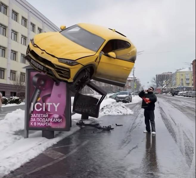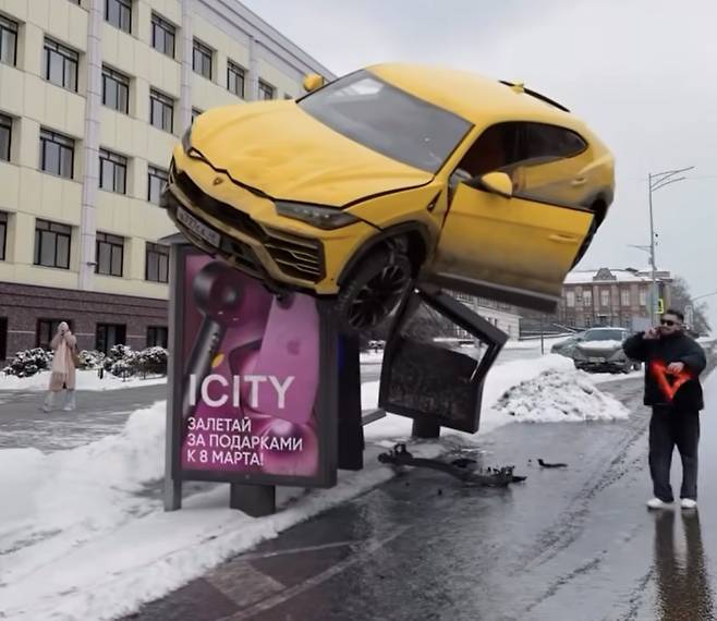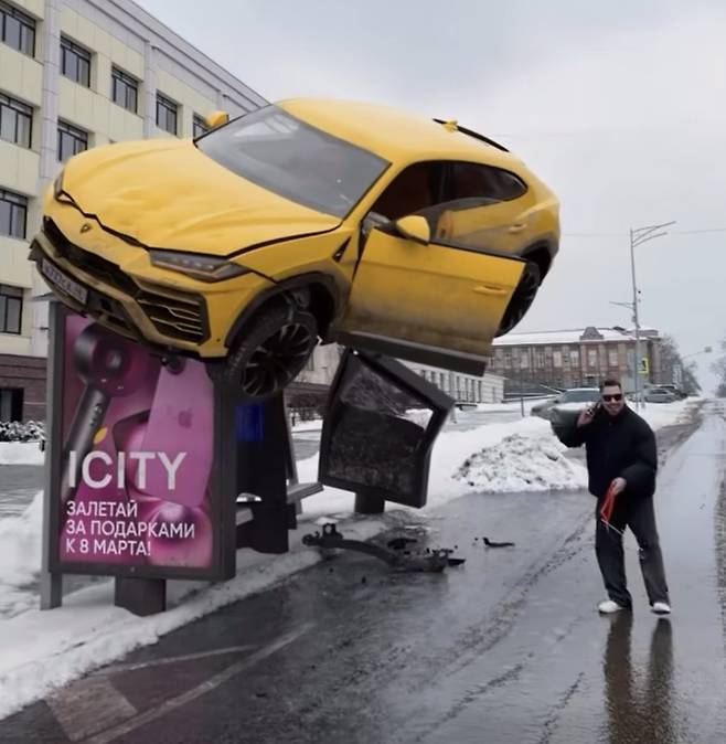 최근 공개된 한 영상에는 버스 정류장 지붕 위에 올라간 람보르기니 SUV가 포착됐으며, 운전석 문이 열려 있다. 한 남성이 러시아어로 통화하면서 도로에 경고 삼각대를 설치하는 모습도 보인다. 사고를 알리고 주변 보행자들이 위험한 구조물에 접근하지 못하도록 조치하는 것이다.