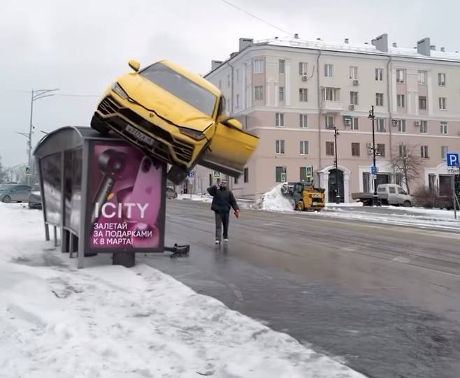 람보르기니 우루스는 어떻게 버스 정류장 지붕 위에 올라갔을까?